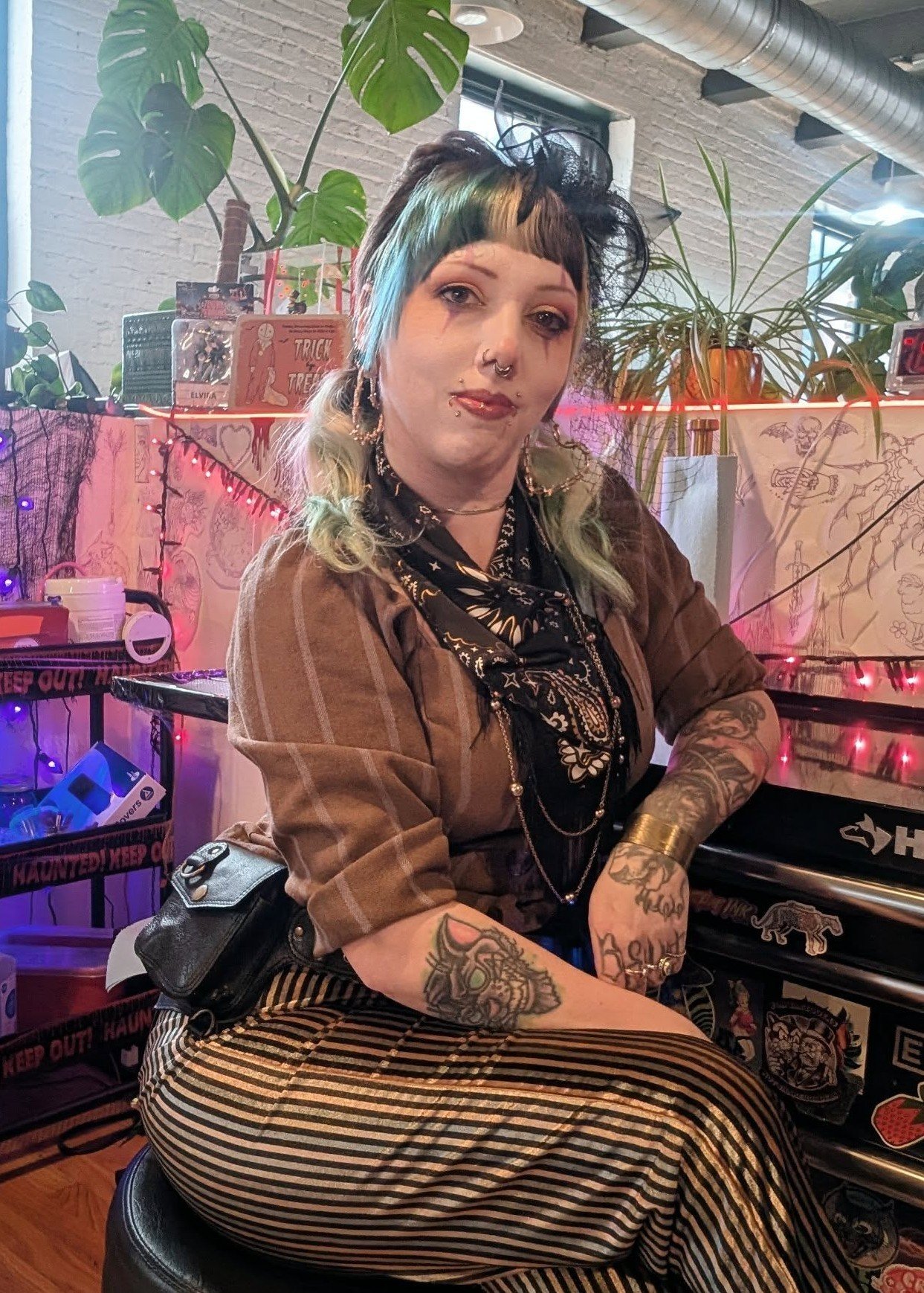Aiden draws inspiration from the natural world and queer magic. Their illustrative style encompasses linework, black and grey, and vibrant color designs.